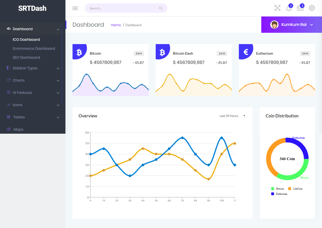 Brighten everyone’s day with the pop colors of the SRT Dash admin panel template. This is good to use when it comes to dealing with multiple data. You will also keep track of the records using the chart widgets.