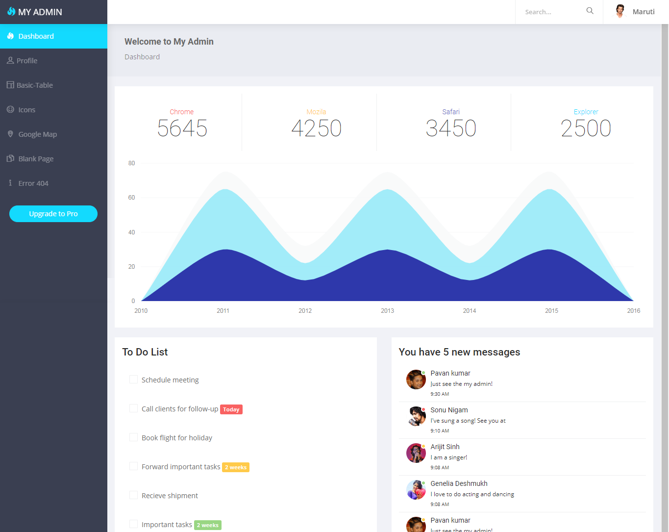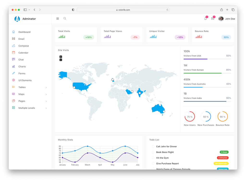 Specifically designed for activity tracking and profile management, My Admin Lite is the best option. It is quite similar to the Ample Admin Lite regarding the light theme color and clean design. The many options for the to-do list, message board, and traffic stats are from its dashboard. You can choose the search bar and the profile details in the topmost bar. There is no need to minimize the navigation bar on the side. It is a lite version as its options and elements are limited.