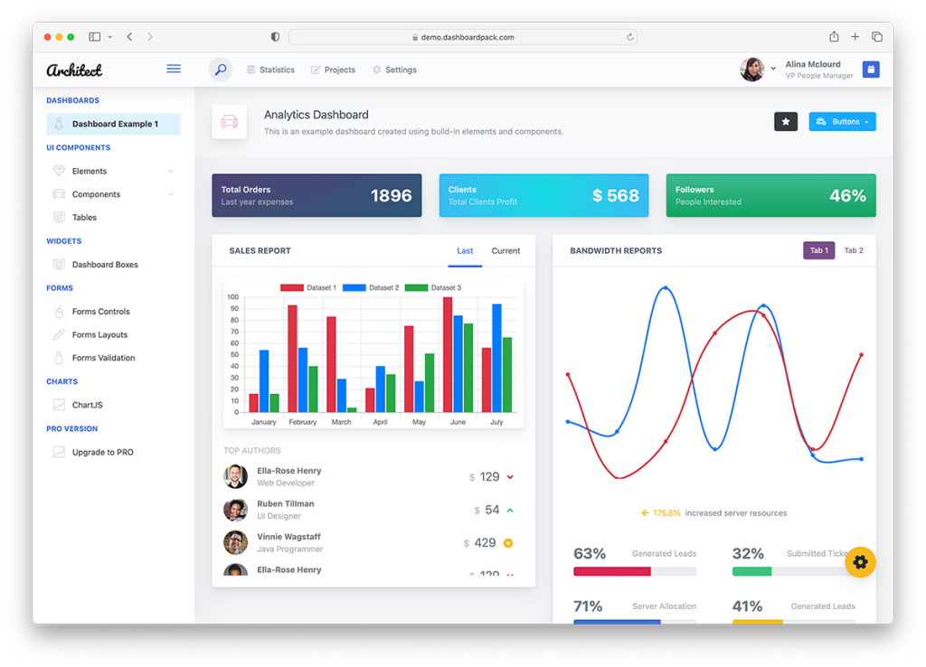 For a classy-looking admin panel template, Gentella is the one to ever consider in mind. Love this template featuring many elements interactively. It is free in three variations of the dashboard. The hover effects are impressive as these show you the accurate data of the graphs. Adjust the navigation menu if you feel like it is obtrusive. The left sidebar will introduce you to the footer and navigation options. An option for full-view, log out option, and settings are also available. There is also a place to include a welcome message and user profile picture in the sidebar and top bar.