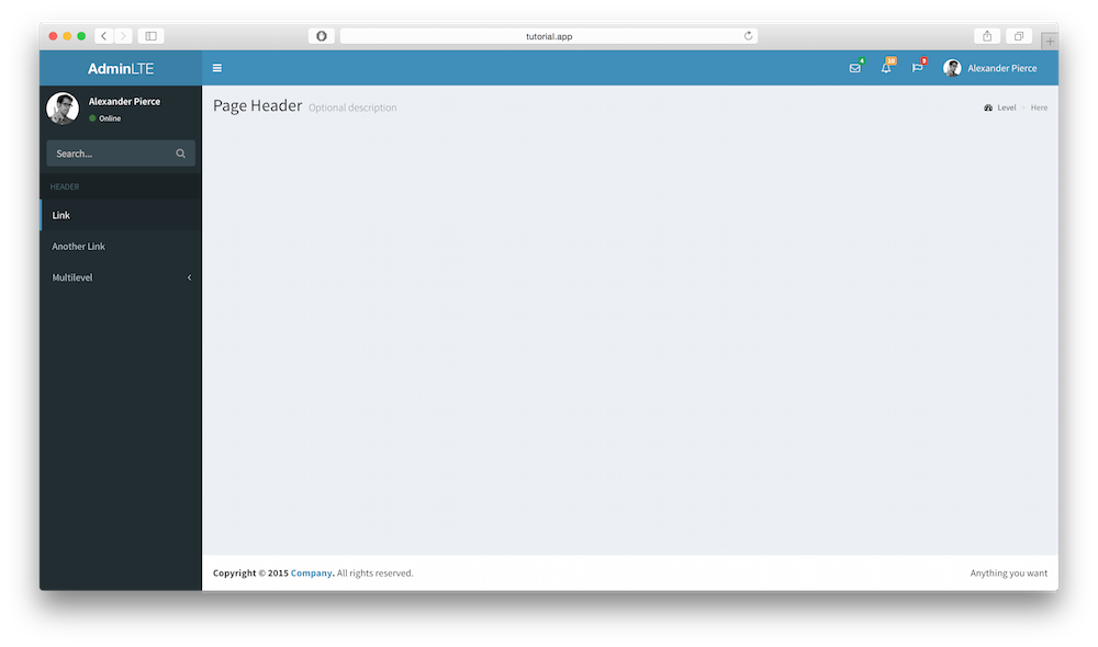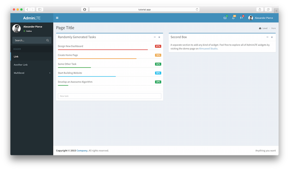 AdminLTE is a great dashboard template but it is built with pure HTML and CSS. In this tutorial, I’d like to go through installing AdminLTE with Laravel 5 like pros. We will make sure that we have the ability to update AdminLTE to the latest version at any given time by using Bower to manage it.